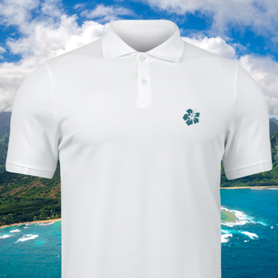 Take a piece of Hawaii with you on the golf course with our NEW golf shirt that features a hibiscus flower.